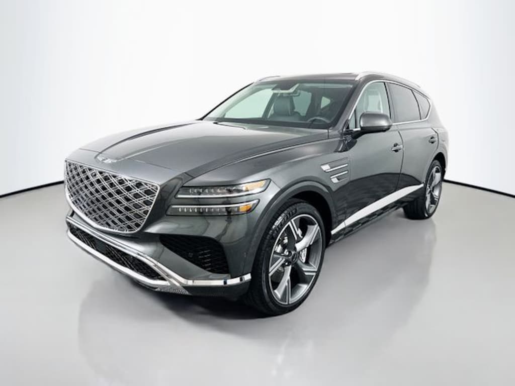 Certified. Gray 2025 Genesis GV80 2.5T Prestige AWD 8-Speed Automatic 2.5L DOHC 18 Speakers, 4-Wheel Disc Brakes, Adaptive suspension, Air Conditioning, AM/FM radio: SiriusXM, Anti-whiplash front head restraints, Auto High-beam Headlights, Auto tilt-away steering wheel, Auto-dimming door mirrors, Auto-dimming Rear-View mirror, Automatic temperature control, Brake assist, Bumpers: body-color, Cargo Net, Delay-off headlights, Driver vanity mirror, Dual front impact airbags, Dual front side impact airbags, Electronic Stability Control, Emergency communication system: Genesis Connected Services, Exterior Parking Camera Rear, Four wheel independent suspension, Fragrance Cartridge, Front Bucket Seats, Front Center Armrest, Front dual zone A/C, Front reading lights, Fully automatic headlights, Garage door transmitter: HomeLink, Genuine wood console insert, Genuine wood dashboard insert, Genuine wood door panel insert, Heads-Up Display, Heated & Ventilated Front Bucket Seats, Heated door mirrors, Heated front seats, Heated rear seats, Heated steering wheel, Illuminated entry, Knee airbag, Leather Seating Surfaces, Leather steering wheel, Low tire pressure warning, Memory seat, Navigation System, NFC Key Card, Occupant sensing airbag, Option Group 01, Outside temperature display, Overhead airbag, Overhead console, Panic alarm, Passenger vanity mirror, Power door mirrors, Power driver seat, Power Liftgate, Power moonroof, Power passenger seat, Power steering, Power windows, Radio data system, Radio: AM/FM/SiriusXM/HD Bang & Olufsen Sound Sys, Rain sensing wipers, Rear air conditioning, Rear anti-roll bar, Rear reading lights, Rear seat center armrest, Rear side impact airbag, Rear window defroster, Rear window wiper, Remote keyless entry, Security system, Speed-sensing steering, Speed-Sensitive Wipers, Split folding rear seat, Spoiler, Steering wheel memory, Steering wheel mounted audio controls, Tachometer, Traction control, Turn signal indicator mirrors, Variably intermittent wipers, Ventilated front seats, Wheels: 22" x 9.5J Dark Gray Matte Alloy.